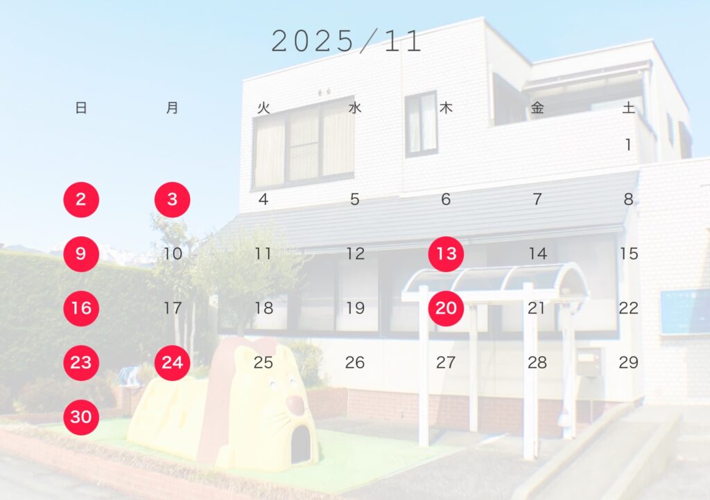 2025年11月1日 / 最終更新日時 : 2025年11月1日 カワサキ歯科医院 ブログ 2025年11月の診療カレンダー こんにちは。カワサキ歯科医院です。 11月の診療日カレンダーです。 祝日のある週の木曜日は診療日となります。 朝晩は特に寒くなってきました。体調崩されないよう、お気をつけてください。